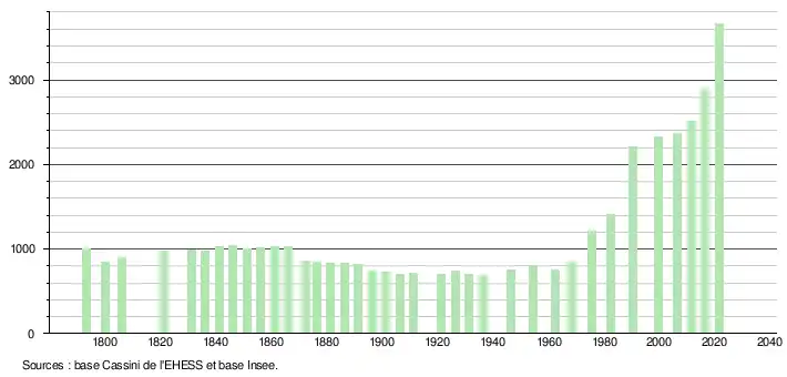 L'évolution du nombre d'habitants est connue à travers les recensements de la population effectués dans la commune depuis 1793. Pour les communes de moins de 10 000 habitants, une enquête de recensement portant sur toute la population est réalisée tous les cinq ans, les populations légales des années intermédiaires étant quant à elles estimées par interpolation ou extrapolation[25]. Pour la commune, le premier recensement exhaustif entrant dans le cadre du nouveau dispositif a été réalisé en 2006[26].
