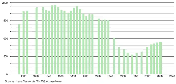 L'évolution du nombre d'habitants est connue à travers les recensements de la population effectués dans la commune depuis 1793. Pour les communes de moins de 10 000 habitants, une enquête de recensement portant sur toute la population est réalisée tous les cinq ans, les populations légales des années intermédiaires étant quant à elles estimées par interpolation ou extrapolation[44]. Pour la commune, le premier recensement exhaustif entrant dans le cadre du nouveau dispositif a été réalisé en 2005[45].