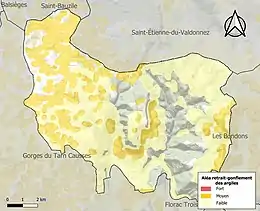 Le retrait-gonflement des sols argileux est susceptible d'engendrer des dommages importants aux bâtiments en cas d’alternance de périodes de sécheresse et de pluie. 28,7 % de la superficie communale est en aléa moyen ou fort (15,8 % au niveau départemental et 48,5 % au niveau national). Sur les 615 bâtiments dénombrés sur la commune en 2019, 53 sont en aléa moyen ou fort, soit 9 %, à comparer aux 14 % au niveau départemental et 54 % au niveau national. Une cartographie de l'exposition du territoire national au retrait gonflement des sols argileux est disponible sur le site du BRGM[35],[Carte 2].