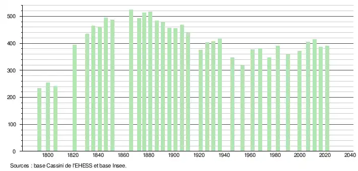 L'évolution du nombre d'habitants est connue à travers les recensements de la population effectués dans la commune depuis 1793. Pour les communes de moins de 10 000 habitants, une enquête de recensement portant sur toute la population est réalisée tous les cinq ans, les populations légales des années intermédiaires étant quant à elles estimées par interpolation ou extrapolation[17]. Pour la commune, le premier recensement exhaustif entrant dans le cadre du nouveau dispositif a été réalisé en 2006[18].