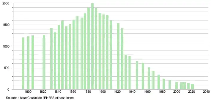 L'évolution du nombre d'habitants est connue à travers les recensements de la population effectués dans la commune depuis 1793. Pour les communes de moins de 10 000 habitants, une enquête de recensement portant sur toute la population est réalisée tous les cinq ans, les populations légales des années intermédiaires étant quant à elles estimées par interpolation ou extrapolation[23]. Pour la commune, le premier recensement exhaustif entrant dans le cadre du nouveau dispositif a été réalisé en 2005[24].