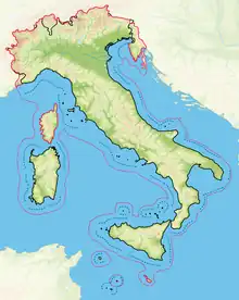 L'Italie est une région géographique d'Europe du Sud d'une superficie de 324 000 km2[1],[2], délimitée au nord-ouest et au nord par les Alpes et par la mer Méditerranée pour le reste. Correspondant aux territoires de l'Italie, de Saint-Marin, du Vatican, de Monaco et de Malte auxquels il faut rajouter des portions de la France, de la Suisse, de la Slovénie et de la Croatie, cette région se compose de trois parties : une partie continentale dans le nord, une partie péninsulaire au centre et une zone insulaire dans le sud et l'ouest. Située entre la péninsule Ibérique et la péninsule Balkanique, elle est baignée par plusieurs subdivisions de la mer Méditerranée : la mer Ligurienne, la mer Tyrrhénienne, la mer Ionienne et la mer Adriatique.