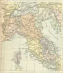 « L'Italie, dans les limites que nous lui avons assignées, considérée comme région géographique, est actuellement partagée en treize parties d'une étendue très différente ; elles forment autant d'états divers, ou bien elles appartiennent à d'autres situés hors de ses limites. Ces treize divisions politiques sont : l'Italie-Autrichienne ; l'Italie-Suisse; le royaume Sarde ; la principauté de Monaco ; les duchés de Lucques, de Parme et de Modène ; le grand-duché de Toscane ; la république de Saint-Marin ; les États du Pape ; le royaume des Deux-Siciles ; l'Italie-Française et l'Italie-Anglaise[5]. »