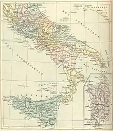 À partir du Ier siècle, l'Italie désigne en grande partie le territoire de l'actuelle République italienne, du point de vue politique avec la division administrative d'Auguste, mais aussi géographique avec traité de géographie de Strabon[8]. À la suite de la chute de l'Empire romain d'Occident, et en particulier à l'arrivée des Lombards en Italie, l'Italie a perdu son unité politique mais a continué à garder son unité géographique de telle sorte que le chancelier Metternich de l'empire d'Autriche pouvait encore affirmer vers le milieu du XIXe siècle que l'Italie n'était qu'une simple expression géographique.
