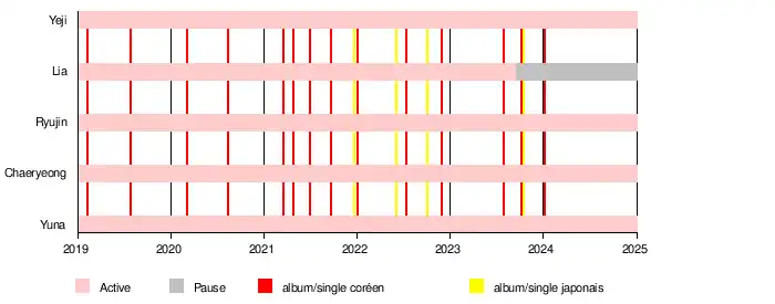| Yeji | 예지 | Hwang Ye-ji | 황 예지 | Leader, chanteuse, rappeuse, danseuse et unnie (la plus âgée) | ||