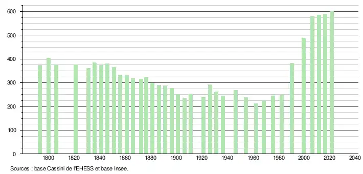 L'évolution du nombre d'habitants est connue à travers les recensements de la population effectués dans la commune depuis 1793. Pour les communes de moins de 10 000 habitants, une enquête de recensement portant sur toute la population est réalisée tous les cinq ans, les populations légales des années intermédiaires étant quant à elles estimées par interpolation ou extrapolation[48]. Pour la commune, le premier recensement exhaustif entrant dans le cadre du nouveau dispositif a été réalisé en 2006[49].