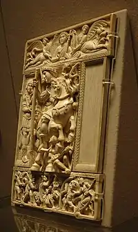 - Les autres ivoires comparables de cette époque sont en effet des diptyques ecclésiastiques tels que l'évangile de Saint-Lupicin ou la reliure d'Etschmiadzin.