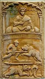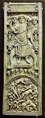 Les diptyques impériaux à cinq pans sont une autre production très byzantine. Ce sont des cadeaux très somptueux faits à l'empereur. L'exemple le plus fameux est le diptyque Barberini. En réalité, c'est le seul exemplaire qui nous soit parvenu dans un assez bon état puisqu'il est quasiment complet. Les Byzantins produisent des exemplaires de très grande taille, ce qui accentue encore la marque de richesse puisque l'ivoire, à cette époque, vient à manquer. Ce diptyque montre l'empereur[15] dans toute sa gloire, dans une formule assez romaine. La différence c'est le cortège d'offrandes des peuples soumis à lui, qui lui apportent les tributs les plus précieux au nombre desquels se compte l'ivoire. Le VIe siècle est le siècle de "l'apogée justinienne". L'empire est très vaste, il a reconquis Rome, une partie de l'Afrique du nord qui continue, entre autres, à assurer son approvisionnement en ivoire. La capitale est prospère et rayonne à travers le monde.
