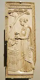 L'ivoire couvre des domaines assez variés tout en étant un matériau de luxe. L'Antiquité tardive, période charnière dans tous les domaines, apporte de profonds changements politiques, religieux et économiques qui influenceront définitivement l'art de l'ivoire. L'"effondrement"[11] de l'empire romain entraîne une rétraction de l'économie vers les grands centres urbains où se concentre le pouvoir et donc, la richesse. Dans ce cadre, on assiste à une véritable thésaurisation de l'ivoire qui devient le signe extérieur de cette richesse et prend un caractère somptuaire, de luxe. En milieu italien se crée un nouveau type "d'objets d'art", les diptyques consulaires d'ivoire. L'emploi de ceux-ci étaient avant très ordinaire, on recourait à des plaquettes en bois, en os ou en métal à caractère aussi bien officiel que privé. Dorénavant ce sont des diptyques d'ivoire que les consuls romains prennent l'habitude d'émettre à leur entrée en charge. Ils ont même l'apanage d'une telle pratique depuis une loi de 384. Ces objets servent donc à la manifestation du pouvoir.