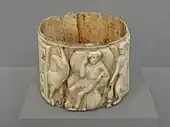 L'ivoire, du latin ebur, fut de bonne heure conçu, apprécié, employé dans les arts grecs, romains ou asiatiques. Ce fut une des matières[2] les plus recherchées et sa vogue ne parut jamais subir de diminution. L'ivoire ou "dentine" est une matière minéralisée très dure, une variété de tissu osseux qui constitue la structure des dents. La croissance de l'ivoire en lamelles superposées est différente selon les espèces comme dans le bois. Il existe en fait toute une gamme d'ivoire venant de différents animaux[3]. Dans l'Antiquité, c'est l'ivoire d'éléphant qui est le plus utilisé. Les défenses sont ces incisives supérieures centrales à croissance continue. Elles sont légèrement arquées et de diamètre décroissant et peuvent atteindre des diamètres importants (jusqu'à 30 cm). La masse de la défense est constituée de couches successives en cônes emboîtés. Cet "édifice" d'ivoire est chemisé de cément sur une épaisseur pouvant atteindre 1 cm, c'est la « croûte » des ivoiriers.