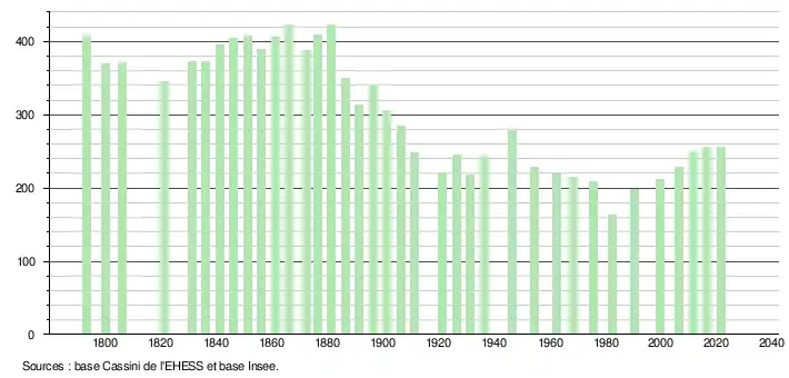 L'évolution du nombre d'habitants est connue à travers les recensements de la population effectués dans la commune depuis 1793. Pour les communes de moins de 10 000 habitants, une enquête de recensement portant sur toute la population est réalisée tous les cinq ans, les populations légales des années intermédiaires étant quant à elles estimées par interpolation ou extrapolation[29]. Pour la commune, le premier recensement exhaustif entrant dans le cadre du nouveau dispositif a été réalisé en 2006[30].