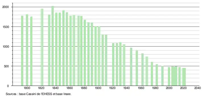 L'évolution du nombre d'habitants est connue à travers les recensements de la population effectués dans la commune depuis 1793. Pour les communes de moins de 10 000 habitants, une enquête de recensement portant sur toute la population est réalisée tous les cinq ans, les populations légales des années intermédiaires étant quant à elles estimées par interpolation ou extrapolation[23]. Pour la commune, le premier recensement exhaustif entrant dans le cadre du nouveau dispositif a été réalisé en 2004[24].