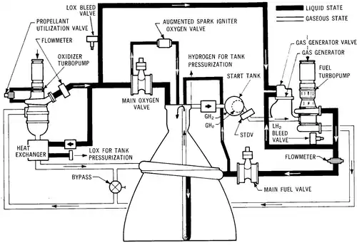 La mise sous pression de l'hydrogène et de l'oxygène est réalisée grâce à un générateur de gaz et deux turbopompes pour l'hydrogène et l'oxygène. La présence de deux turbopompes permet notamment de faire varier facilement le rapport de mélange, en jouant sur la vitesse de rotation de la turbopompe à oxygène (entre 6 000 et 8 800 tours par minute). La vitesse de rotation de la turbopompe à hydrogène, qui comprend 7 étages, est par contre constante, à 27 500 tours par minute. Les turbopompes sont mises en rotation par le gaz produit par le générateur de gaz, solidaire de la turbopompe à hydrogène. Les gaz produits sont d'abord injectés dans la turbine de la turbopompe à hydrogène, avant d'être récupérés et injectés dans la turbine de la turbopompe à oxygène. En sortie de cette turbine, ils sont réinjectés dans la chambre de combustion, permettant ainsi un petit gain de poussée[3],[2].