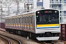 : 5 Formations de 4 voitures de la série 205–3000 (de 2003 au 15 juillet 2018)[Note 12] / 10 voitures de la série 205–0 décors (de juillet 1989 à octobre 2016) - Ligne Keihin-Tōhoku