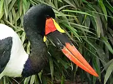 Échassier de grande taille, c'est la plus grande espèce de cigognes avec le Marabout d'Afrique. C'est un oiseau élégant avec un cou, des pattes et un bec particulièrement allongés. Le plumage est bicolore : le cou, la tête, les ailes (excepté les rémiges) et le dos sont noirs, le reste est blanc. Le cou est parfois légèrement irisé. Les jambes sont noires, mais les "genoux" et les pieds sont rouge-orangé. Le bec est particulièrement impressionnant : très long et conique, il est rouge-orangé et marqué au 2e quart de sa longueur par une bande noire. La base du bec est recouverte par une large caroncule aplatie en forme de selle, d'où le nom de Saddle-billed Stork en anglais). Le mâle possède deux petites caroncules à la base de la mandibule inférieure. Les yeux de la femelle sont jaunes, ceux du mâle, bruns. Ce sont les seuls signes de dimorphisme sexuel chez ces oiseaux, même si le mâle a tendance à être légèrement plus grand. Le juvénile possède le même plumage bicolore, mais les rémiges - blanches chez l'adulte - sont grisâtres. Le bec, par contre, est terne : gris-brun.