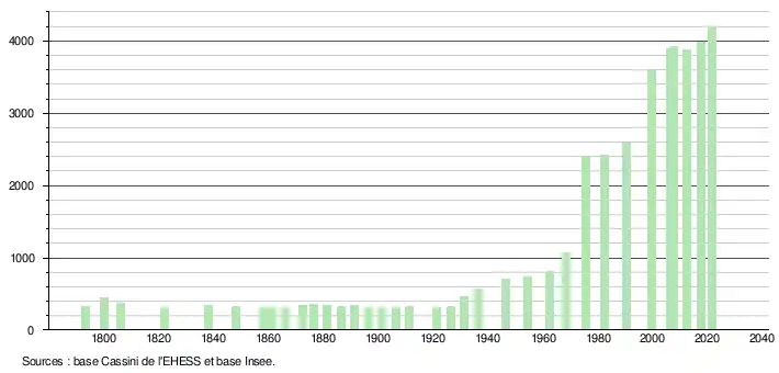 L'évolution du nombre d'habitants est connue à travers les recensements de la population effectués dans la commune depuis 1793. Pour les communes de moins de 10 000 habitants, une enquête de recensement portant sur toute la population est réalisée tous les cinq ans, les populations légales des années intermédiaires étant quant à elles estimées par interpolation ou extrapolation[27]. Pour la commune, le premier recensement exhaustif entrant dans le cadre du nouveau dispositif a été réalisé en 2007[28].