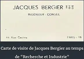 Après la mort de son compagnon de résistance Guivante (Paul Guivante dit) de Saint-Gast le 6 mars 1952 (membre -dirigeant- de Marco-Polo, tout comme son cousin germain député, ministre des finances puis du commerce et de l'industrie Henri Ulver, de 1951 à 1956), Bergier décide de délaisser ses activités d'ingénieur-conseil « chasseur de tête » scientifique et de recherches en synthèse d'ersatz de carburants pour le tiers-monde[jb 4] au sein de la société « Recherches et Industrie », créée avec son ami de lycée — rencontré dès leur arrivée parisienne comme immigrés — Albert Mirlesse, et Saint-Gast, pour se lancer désormais dans l'écriture. Il est ainsi le premier à traduire en français Lovecraft, pour lequel il a une immense admiration et dont il dit avoir été le « correspondant » avant-guerre par le truchement de la revue Weird Tales.