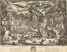 - 1634 : La Tentation de Saint-Antoine. Dans cette eau-forte de 46 × 36 cm environ, Callot traite ce sujet pour la seconde fois[50], avec plus de maturité. La première version avait été faite à Florence, en 1617, et était donc une œuvre de jeunesse.