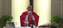Le , jour de la solennité de la Croix glorieuse, le pape François célèbre une messe en la chapelle de la résidence Sainte-Marthe à l'intention du père Hamel, dont la photo est exposée sur l'autel[47]. Le bréviaire du prêtre a été apporté par Lebrun en la basilique San Bartolomeo all'Isola afin d'y être conservé[48]. Environ 80 fidèles du diocèse de Rouen l'accompagnent en pèlerinage[49],[50]. Dans son homélie, le pape déclare que Jacques Hamel, « assassiné sur la croix, [...] fait partie de la chaîne des martyrs[51] », et ajoute que ce prêtre est un « bienheureux » qu'il faut prier[52]: « Nous devons le prier, c’est un martyr, et les martyrs sont des bienheureux, pour qu’il nous donne à tous la fraternité, la paix, et aussi le courage de dire la vérité : tuer au nom de Dieu est satanique. »