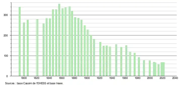 L'évolution du nombre d'habitants est connue à travers les recensements de la population effectués dans la commune depuis 1793. Pour les communes de moins de 10 000 habitants, une enquête de recensement portant sur toute la population est réalisée tous les cinq ans, les populations légales des années intermédiaires étant quant à elles estimées par interpolation ou extrapolation[14]. Pour la commune, le premier recensement exhaustif entrant dans le cadre du nouveau dispositif a été réalisé en 2008[15].