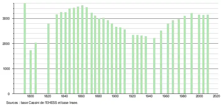 L'évolution du nombre d'habitants est connue à travers les recensements de la population effectués dans la commune depuis 1793. À partir du , les populations légales des communes sont publiées annuellement dans le cadre d'un recensement qui repose désormais sur une collecte d'information annuelle, concernant successivement tous les territoires communaux au cours d'une période de cinq ans. Pour les communes de moins de 10 000 habitants, une enquête de recensement portant sur toute la population est réalisée tous les cinq ans, les populations légales des années intermédiaires étant quant à elles estimées par interpolation ou extrapolation[13]. Pour la commune, le premier recensement exhaustif entrant dans le cadre du nouveau dispositif a été réalisé en 2004[14],[Note 1].