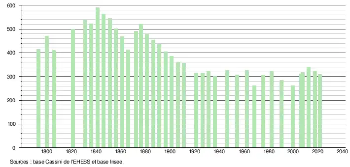 L'évolution du nombre d'habitants est connue à travers les recensements de la population effectués dans la commune depuis 1793. Pour les communes de moins de 10 000 habitants, une enquête de recensement portant sur toute la population est réalisée tous les cinq ans, les populations légales des années intermédiaires étant quant à elles estimées par interpolation ou extrapolation[16]. Pour la commune, le premier recensement exhaustif entrant dans le cadre du nouveau dispositif a été réalisé en 2007[17].