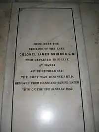 James Skinner meurt le à Hansi (Haryana). Il est d’abord enterré dans le cimetière militaire de Hansi. 40 jours plus tard () son corps est ramené à Delhi escorté par 200 cavaliers de son régiment des Skinners’ horses et solennellement placé dans un caveau sous l’autel de l’église Saint-Jacques. De nombreux membres de sa famille - il aurait eu quatorze femmes - sont enterrés dans un enclos situé immédiatement au nord de l’église.
