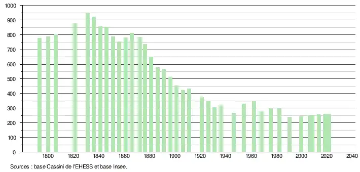 L'évolution du nombre d'habitants est connue à travers les recensements de la population effectués dans la commune depuis 1793. Pour les communes de moins de 10 000 habitants, une enquête de recensement portant sur toute la population est réalisée tous les cinq ans, les populations légales des années intermédiaires étant quant à elles estimées par interpolation ou extrapolation[15]. Pour la commune, le premier recensement exhaustif entrant dans le cadre du nouveau dispositif a été réalisé en 2008[16].