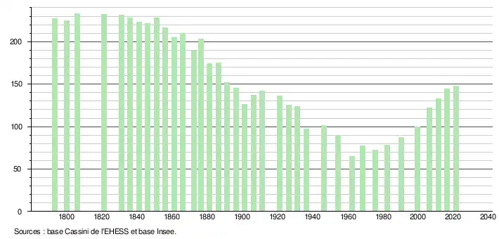 L'évolution du nombre d'habitants est connue à travers les recensements de la population effectués dans la commune depuis 1793. Pour les communes de moins de 10 000 habitants, une enquête de recensement portant sur toute la population est réalisée tous les cinq ans, les populations légales des années intermédiaires étant quant à elles estimées par interpolation ou extrapolation[14]. Pour la commune, le premier recensement exhaustif entrant dans le cadre du nouveau dispositif a été réalisé en 2006[15].