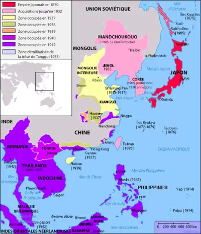 La crise économique de 1929 et la montée des tensions internationales dans les années 1930 mettent ce système sous pression et favorisent la prise de pouvoir des militaires. L'expansionnisme du Japon reprend avec l'invasion de la Mandchourie en 1931 puis des provinces du nord de la Chine. Un important complexe militaro-industriel voit le jour, s'appuyant sur de puissants conglomérats, les zaibatsu. L'empire se lance en 1937 dans une invasion de la Chine, mais s'enlise dans ce conflit et voit se liguer contre lui les puissances occidentales. Le Japon prend alors le parti d'attaquer les Etats-Unis à Pearl Harbor en 1941 et se lance dans la « libération » de nombreuses colonies occidentales en Asie. Derrière ce but affiché de libérer ces pays, le Japon vise alors à faire émerger une sphère de coprospérité de la Grande Asie orientale qui n'est qu'une sphère d'influence pour le pays. La Japon est cependant vaincu militairement et doit capituler le après les bombardements atomiques d'Hiroshima et de Nagasaki. Les militaires commettent de nombreux crimes de guerre lors de cette période (massacre de Nankin[24], femmes de réconfort, Unité 731, exactions sur des prisonniers de guerre...).