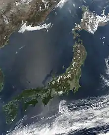L'État du Japon forme, dans l'Est de l'Asie, un archipel de 6 852 à 14 125 îles — bien que ce nombre varie suivant les estimations — de plus de 100 m2 sur plus de trois mille kilomètres de long, face à la Russie (îles Kouriles), Taïwan, la Corée et la Chine[50],[51],[52],[53]. Sur les 6 852 îles que compte le Japon, environ 430 sont habitées[50]. Quatre de ces îles — du nord au sud, Hokkaidō (79 000 km2), historiquement peuplée par les Aïnous, Honshū (227 000 km2) la plus grande et la plus peuplée avec 105 millions d'habitants, Shikoku (18 000 km2) qui est l'île de la mer intérieure et Kyūshū (36 000 km2) — représentent l'essentiel d'un territoire de 377 975 km2[54] (95 % du territoire des 4 000 îles de l'arc insulaire)[55]. Ces quatre îles forment le bloc centralinsulaire (Hondo)[50].