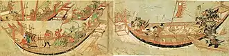 À partir du XVIe siècle, des commerçants venus tout d'abord du Portugal (1543), puis des Pays-Bas et d'Angleterre débarquèrent au Japon avec des missionnaires chrétiens. Pendant la première partie du XVIIe siècle, le bakufu (shogunat) Tokugawa craignit que ces missionnaires portugais ne fussent la source de périls analogues à ceux que subirent ses voisins (telles les prémices d'une conquête militaire par les puissances européennes ou un anéantissement[note 3]) et la religion chrétienne fut formellement interdite en 1635 sous peine de mort accompagnée de torture. Puis, en 1639, le Japon cessa toute relation avec l'étranger, à l'exception de certains contacts restreints avec des marchands chinois et néerlandais à Nagasaki, précisément sur l'île de Dejima.