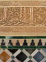 Si elle sous-tend le dessin du jardin, la géométrie s’efface cependant devant le décor : les motifs floraux animent les parois et les stucs et la cursive de l’écriture coufique[5] développe son foisonnement de feuillages entrelacés. Les textes inscrits mêlent versets du Coran, informations sur la construction et poésies :