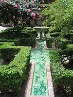 - L’étage de l’eau : Un étage inférieur est occupé par les fontaines et rigoles qui distribuent l’eau en l’économisant et la recyclant. Les buis taillés sont utilisés pour leur exceptionnelle sobriété et leur résistance. Les pavements sont travaillés pour exploiter les rais de lumière qui percent le feuillage. On privilégie la variété des matériaux et des textures, céramiques vernissées et marbres sont combinées avec la brique et la pierre.