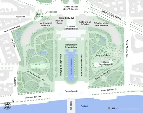 Les jardins du Trocadéro sont situés dans le 16e arrondissement de Paris, face à la Seine. Ils ont une superficie de 93 930 m2.