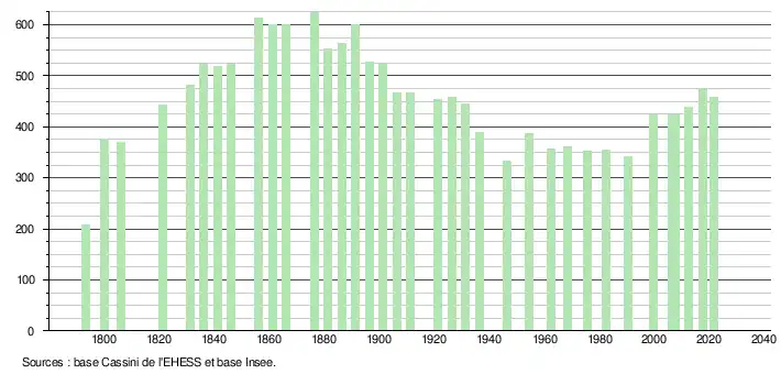 L'évolution du nombre d'habitants est connue à travers les recensements de la population effectués dans la commune depuis 1793. Pour les communes de moins de 10 000 habitants, une enquête de recensement portant sur toute la population est réalisée tous les cinq ans, les populations légales des années intermédiaires étant quant à elles estimées par interpolation ou extrapolation[32]. Pour la commune, le premier recensement exhaustif entrant dans le cadre du nouveau dispositif a été réalisé en 2007[33].