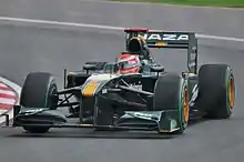 Le , Jarno Trulli est recruté par Lotus Racing et devient le coéquipier de Heikki Kovalainen[31]. Au volant d'une des plus mauvaises monoplaces de la saison 2010, il occupe le fond de grille et ne peut rien espérer et termine vingt-et-unième du championnat du monde sans avoir inscrit de point pour la première fois de sa carrière, son meilleur résultat étant une quinzième place. Il a abandonné à dix reprises en dix-neuf courses et n'a même pas pris le départ du Grand Prix d'Australie en raison d'un problème hydraulique.