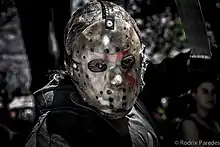 | Caractéristique | Porte un masque de gardien de hockey et une machette |