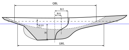 - = quarter-beam length, longueur au quart du maître-bau, le maître bau (B) étant mesuré à hauteur de la ligne de flottaison, la longueur au quart QBL étant elle-même mesurée à une hauteur de B/10 au-dessus de la flottaison. Dans la pratique, aucun architecte ne voulant pénaliser le rating, L = LWL (voir le schéma 1).
