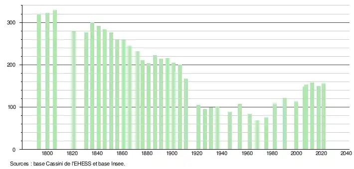 L'évolution du nombre d'habitants est connue à travers les recensements de la population effectués dans la commune depuis 1793. Pour les communes de moins de 10 000 habitants, une enquête de recensement portant sur toute la population est réalisée tous les cinq ans, les populations légales des années intermédiaires étant quant à elles estimées par interpolation ou extrapolation[18]. Pour la commune, le premier recensement exhaustif entrant dans le cadre du nouveau dispositif a été réalisé en 2007[19].