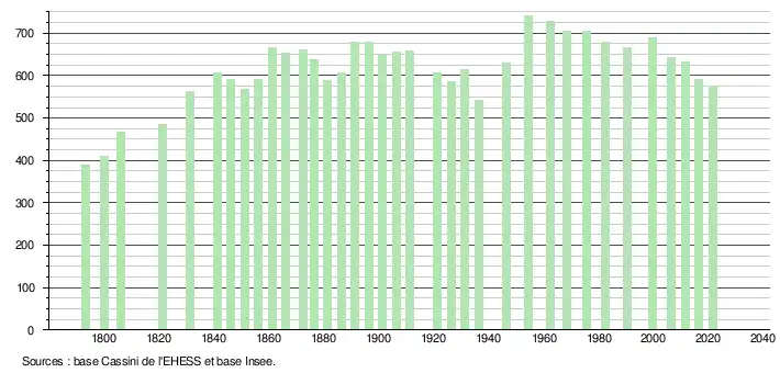 - Population municipale légale en vigueur au 1er janvier 2024, millésimée 2021, définie dans les limites territoriales en vigueur au 1er janvier 2023, date de référence statistique : 1er janvier 2021.