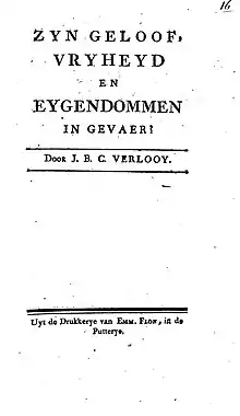Le , il publia un pamphlet néerlandais de quarante pages, Zyn geloof, vryheyd en eygendommen in gevaer? (La foi, la liberté et la propriété, sont-elles en danger ?), contresigné par le fameux chimiste Jean-Baptiste Van Mons, où il faisait le procès des privilégiés, qu'il croyait être devenus « partisans de l'Autriche » et qui « appellent le retour des Allemands ». Verlooy appuya aussi la politique des révolutionnaires français envers la religion[14].