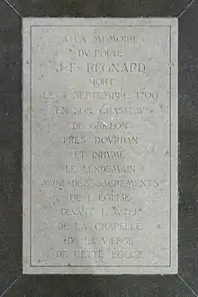 Regnard mourut d’indigestion le en son château de Grillon à Dourdan. Il est inhumé le dans la chapelle de la Vierge de l'église Saint-Germain-d'Auxerre de Dourdan[7].