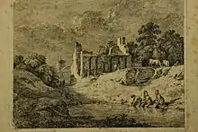 - Vue du château des Échelles à Ambérieux-en-Bugey, vers 1780-1800, plume et encre noire, lavis d’encre grise sur papier vergé, 23,2 x 37,2 cm, musée des Beaux-Arts d’Orléans[21].