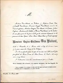2) Eugène Guillaume Van Dievoet, négociant en laine et coton filé, fabricant de couvertures de laine, juge suppléant au tribunal de Commerce (élu le 3 avril 1849, arrêté royal 20 avril 1849) de 1849 à 1851 et juge au tribunal de Commerce de 1851 à 1853 (élu le 8 avril 1851, arrêté royal du 25 avril 1851)[18], né à Molenbeek-Saint-Jean le 11 novembre 1804 (20 brumaire an 13), décédé le 1er février 1858 à midi à Bruxelles, rue des Bogards, Section 8, n° 30, âgé de cinquante trois ans, deux mois, vingt (et un) jours (sur déclaration d’Auguste Poelaert, beau-frère, négociant, 27 ans et Jean Philippe Poelaert, beau-père, sans profession, 67 ans), Le service funèbre fut célébré en l’église de Notre-Dame de Bon Secours le jeudi 4 du même mois à onze heures. L’inhumation eut lieu immédiatement après à Laeken. Réunion à 10h et demie à la maison mortuaire rue des Bogards, 30. Il épousa le 28 octobre 1834 à Bruxelles (tt. Auguste Van Dievoet, frère, avocat, trente et un ans ; Henri Vander Elst, médecin, trente-sept ans), Hortense Poelaert, sœur du célèbre architecte Joseph Poelaert, née le 13 février 1815 à Bruxelles et décédée à Charleroi le 15 avril 1900, à dix heures du matin, 21 rue Léopold, fille de Jean-Philippe Poelaert et d'Isabelle Stas.