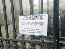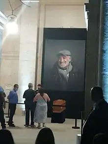 Le lendemain, ses obsèques se déroulent à l'église Saint-Germain-des-Prés en présence des proches et de la famille[54]. La présence de grandes personnalités du cinéma français est remarquée, telle que celles d'Alain Delon, de Pierre Richard ou de Claude Lelouch. Après une multitude d'hommages et une cérémonie religieuse, le cercueil de Jean-Paul Belmondo est crématisé au crématorium du cimetière du Père-Lachaise[55].