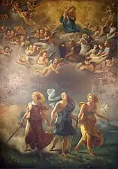- L’Ultra-Romain. – La pensée ne me fait rien. Je vois en ces trois anges trois figures. Qu’ils marchent sur le terrain du paradis terrestre ou sur le tapis vert de Versailles, peu m’importe, ils sont sans pureté de forme, sans précision de silhouette, sans grandeur ; voila tout ce qui me frappe. Allez voir notre divin Raphaël !