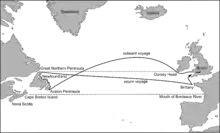 Il touche terre le , mais ne rencontre pas d'indigènes[1]. Il a atteint l'île de Cap-Breton ou l'île de Terre-Neuve, à l'embouchure du fleuve Saint-Laurent, sans qu'il soit possible de localiser le lieu exact du débarquement[7]. Il explore ensuite la côte pendant quelque temps, mais ne se rend plus à terre[1].