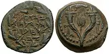 Bien qu'Antiochos VII Évergète (138-129) ait concédé à Simon Maccabée le droit de frapper sa propre monnaie (1 M 15, 6), c'est son fils Jean Hyrcan Ier qui est le premier Hasmonéen à avoir fait usage de ce droit dans les années 127[10] - 110[11]. Elles sont légendées en araméen et émises au nom de « Yehohanan le grand prêtre et la communauté de Jérusalem »[12].