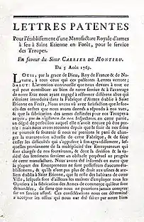 En 1764 c'est autour de Montieu que se regroupent les entrepreneurs d'armes de Saint-Étienne en une société unique qui devient "Manufacture royale d'Armes". Cette Manufacture royale reçoit de Louis XV, par lettres patentes du 5 août 1769[3], à l'instigation de M. de Montbeillard[4], l'exclusivité de la production des armes de guerre, elle s'engage à fabriquer des armes soigneusement contrôlées dans des conditions de travail réglementées. La production des armes passe de 3 000 à 20 000 pièces. Les ouvriers évincés par ce regroupement vont être à l'origine du départ de Montbeillard et de son remplacement par Alexandre Louis Cassier de Bellegarde, un officier à la réputation d'être inflexible et qui contrôle la qualité des armes.